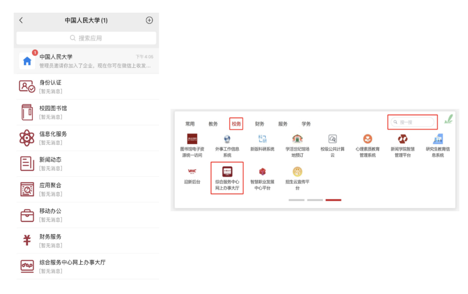 1.手机端微信通讯录点击“伟德国际1946亚洲版”——“综合服务中心网上办事大厅”或电脑登陆微人大,点击校务-综合服务中心网上办事大厅。