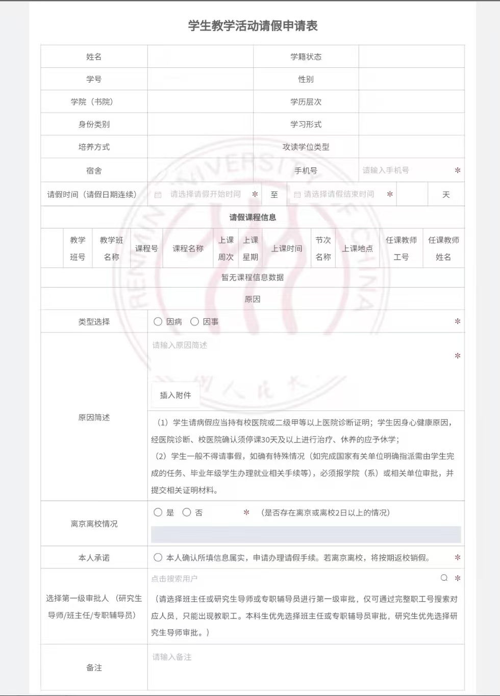 4.如同一原因需要同时办理教学活动和非教学活动请假,均需单独提交请假申请。未按要求办理请假手续或请假未获批准而擅自不参加教学活动、在教学周(不含国际小学期)内擅自离校的,将按规定给予相应纪律处理。
