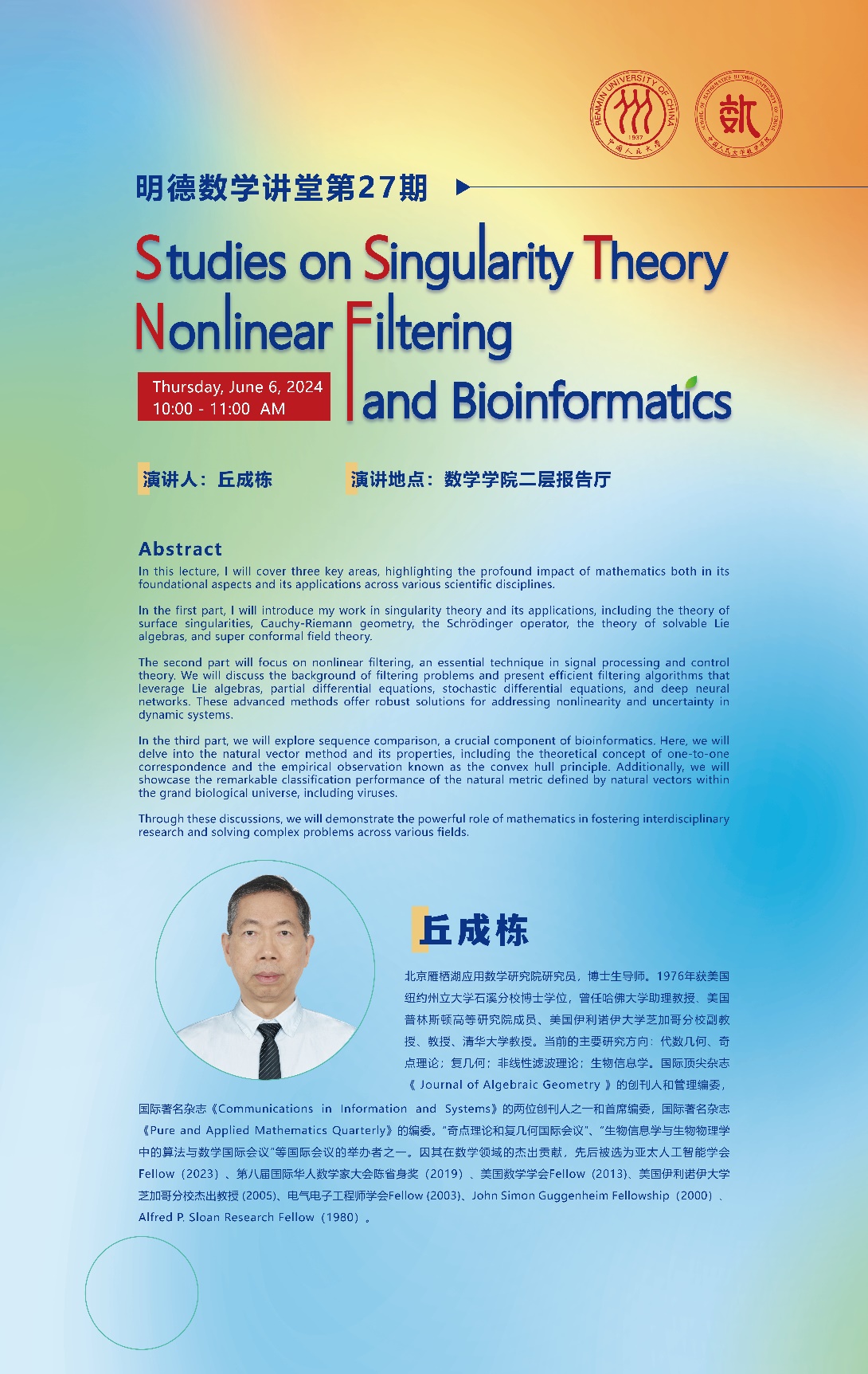 明德数学讲堂将于2024年6月6日上午10:00至11:00在伟德国际victor1946二层报告厅隆重举行!这一期我们邀请到了北京雁栖湖应用数学研究院研究员丘成栋,他将以“Studies on Singularity Theory Nonlinear Filtering and Bioinformatics”为主题开讲。这是一次难得的学习机会,欢迎大家与丘成栋教授进行面对面交流,伟德国际victor1946诚挚邀请大家前来聆听!