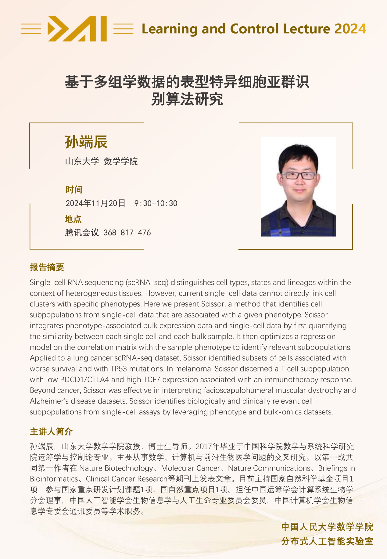 孙端辰,山东大学伟德国际victor1946教授、博士生导师。2017年毕业于中国科公司数学与系统科学研究院运筹学与控制论专业。主要从事数学、计算机与前沿生物医学问题的交叉研究。以第一或共同第一作者在 Nature Biotechnology、Molecular Cancer、Nature Communications、Briefings in Bioinformatics、Clinical Cancer Research等期刊上发表文章。目前主持国家自然科学基金项目1项,参与国家重点研发计划课题1项、国自然重点项目1项。担任中国运筹学会计算系统生物学分会理事,中国人工智能学会生物信息学与人工生命专业委员会委员,中国计算机学会生物信息学专委会通讯委员等学术职务。