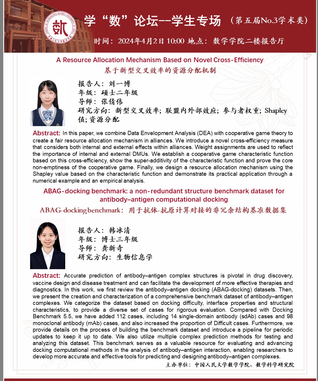 大家好,本届学“数”论坛——员工专场的第三场报告来啦!本场报告类型为学术类,将于2024年4月2日10:00在伟德国际victor1946二楼报告厅举办。主讲嘉宾为硕士二年级的刘一博、任崇娇和博士三年级的韩冰清、赵楠同学。