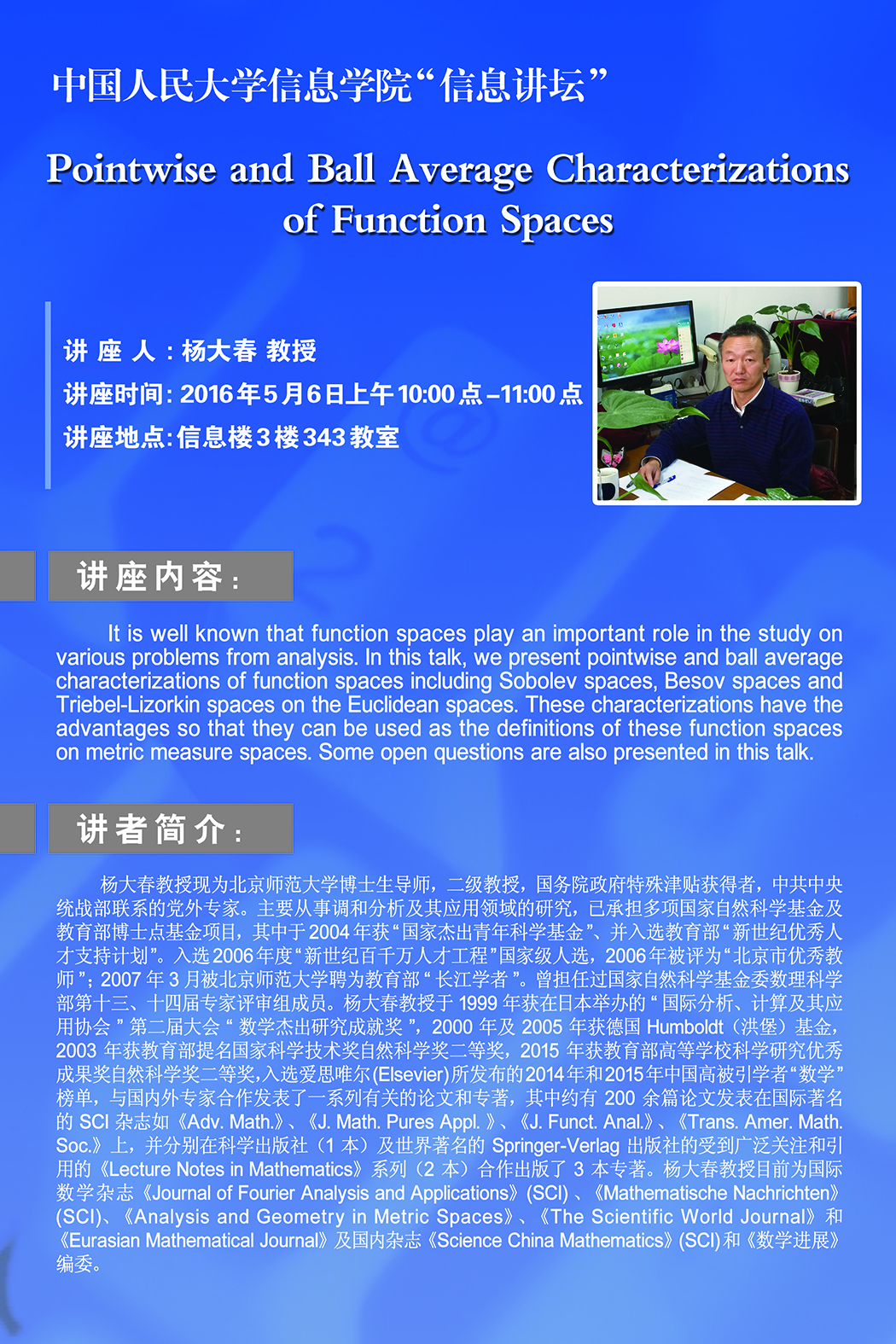杨大春教授现为北京师范大学博士生导师,二级教授,国务院政府特殊津贴获得者,中共中央统战部联系的党外专家。杨大春教授主要从事调和分析及其应用领域的研究,已承担多项国家自然科学基金及教育部博士点基金项目,其中于2004年获“国家杰出青年科学基金”、并入选教育部“新世纪优秀人才支持计划”。入选2006年度“新世纪百千万人才工程”国家级人选,2006年被评为“北京市优秀教师”;2007年3月被北京师范大学聘为教育部“长江学者”。曾担任过国家自然科学基金委数理科学部第十三、十四届专家评审组成员。 杨大春教授于1999年获在日本举办的“国际分析、计算及其应用协会”第二届大会“数学杰出研究成就奖”, 2000年及2005年获德国Humboldt(洪堡)基金, 2003年获教育部提名国家科学技术奖自然科学奖二等奖,2015年获教育部高等公司科学研究优秀成果奖自然科学奖二等奖,入选爱思唯尔(Elsevier)所发布的2014年和2015年中国高被引学者“数学”榜单,与国内外专家合作发表了一系列有关的论文和专著,其中约有200余篇论文发表在国际著名的SCI杂志如《Adv. Math.》、《J. Math. Pures Appl. 》、《J. Funct. Anal.》、《Trans. Amer. Math. Soc.》上,并分别在科学出版社(1本)及世界著名的Springer-Verlag出版社的受到广泛关注和引用的《Lecture Notes in Mathematics》系列(2本)合作出版了3本专著。这些成果受到国内外同行的广泛关注、引用和好评。 杨大春教授目前为国际数学杂志《Journal of Fourier Analysis and Applications》(SCI) 、《Mathematische Nachrichten》(SCI)、《Analysis and Geometry in Metric Spaces》、《The Scientific World Journal》和《Eurasian Mathematical Journal》及国内杂志《Science China Mathematics》(SCI)和《数学进展》编委。 杨大春教授目前已培养14个数学博士,1人任教于美国高校,其余全部任教于国内著名高校, 目前已有教授3人, 副教授8人;1人入选2011年度教育部新世纪优秀人才支持计划,1人获2012年“全国百篇优秀博士论文”提名奖,2人获德国洪堡基金资助, 1人获国家自然科学基金优秀青年基金。