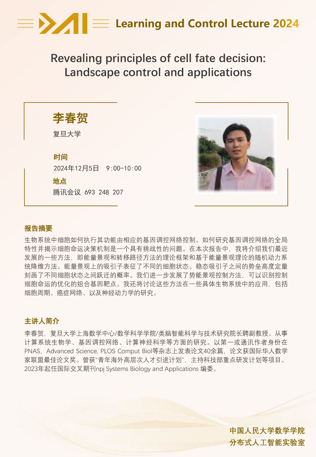 学习与控制系列学术报告:Revealing principles of cell fate decision Landscape control and applications