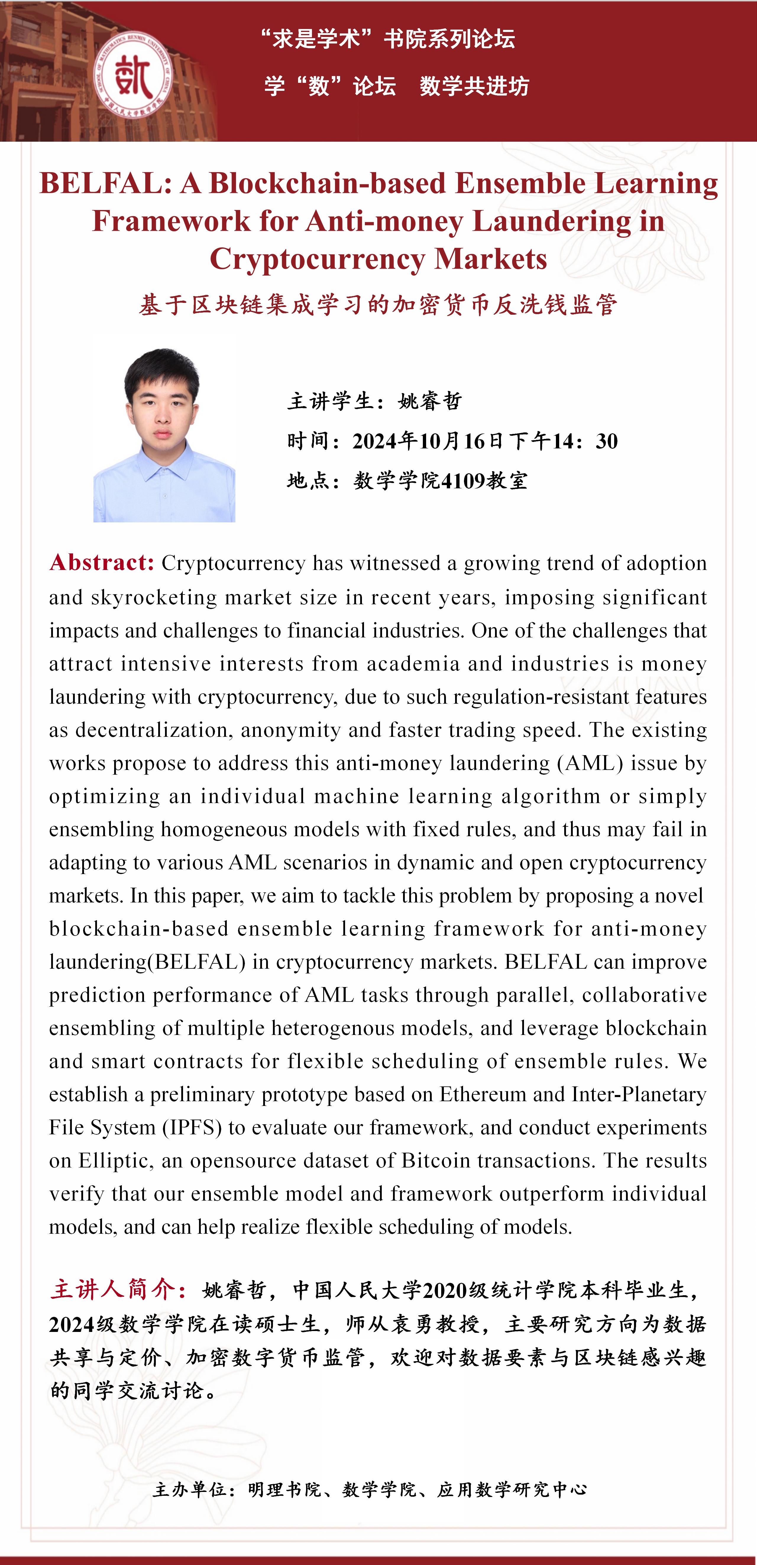 本场报告类型为学术类,将于2024年10月16日(星期三)下午14:30,在伟德国际victor19464109教室进行,报告主讲人为硕士一年级姚睿哲同学,报告题目为《BELFAL: A Blockchain-based Ensemble Learning Framework for Anti-money Laundering in Cryptocurrency Markets》