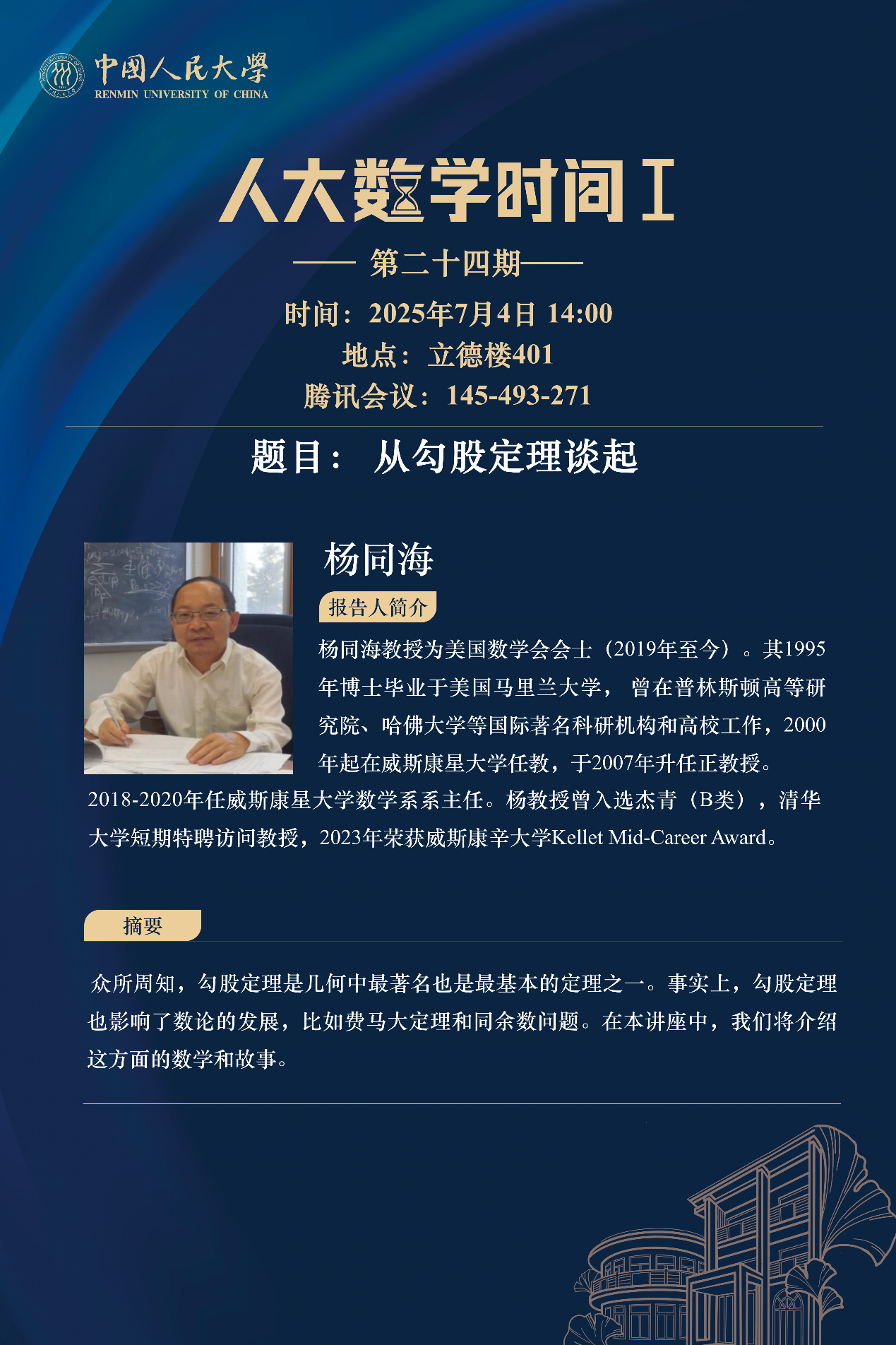 为促进学科交流融合、拓宽师生学术视野、释放科研创新活力,助力人大数学学科走向一流,伟德国际1946亚洲版设立“人大数学时间”,以专题研讨、高端学术论坛为载体,搭建数学思想充分碰撞、优秀人才不断涌流、创造活力竞相迸发的舞台。“人大数学时间”将持之以恒,久久为功,立志通过交流与创新、提出重大问题,引领数学学科及相关领域的创新与发展,成为对我国数学发展有贡献意义的平台。以下为“人大数学时间I”第二十四期信息: