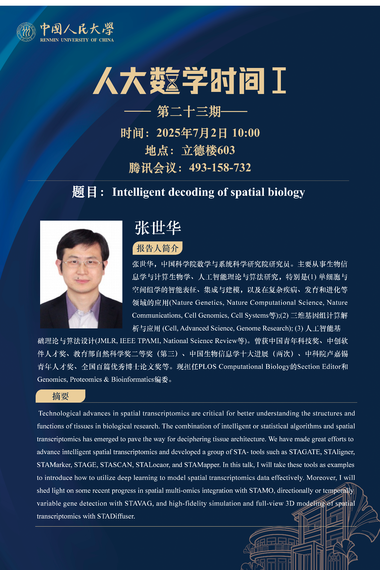 张世华,中国科公司数学与系统科学研究院研究员。主要从事生物信息学与计算生物学、人工智能理论与算法研究,特别是(1) 单细胞与空间组学的智能表征、集成与建模,以及在复杂疾病、发育和进化等领域的应用(Nature Genetics, Nature Computational Science, Nature Communications, Cell Genomics, Cell Systems等); (2) 三维基因组计算解析与应用 (Cell, Advanced Science, Genome Research); (3) 人工智能基础理论与算法设计(JMLR, IEEE TPAMI, National Science Review等)。曾获中国青年科技奖、中创软件人才奖、教育部自然科学奖二等奖(第三)、中国生物信息学十大进展(两次)、中科院卢嘉锡青年人才奖、全国百篇优秀博士论文奖等。现担任PLOS Computational Biology的Section Editor和Genomics, Proteomics & Bioinformatics编委。