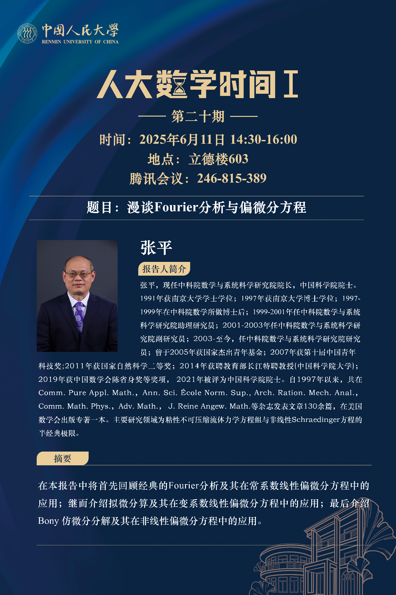 为促进学科交流融合、拓宽师生学术视野、释放科研创新活力,助力人大数学学科走向一流,伟德国际1946亚洲版设立“人大数学时间”,以专题研讨、高端学术论坛为载体,搭建数学思想充分碰撞、优秀人才不断涌流、创造活力竞相迸发的舞台。“人大数学时间”将持之以恒,久久为功,立志通过交流与创新、提出重大问题,引领数学学科及相关领域的创新与发展,成为对我国数学发展有贡献意义的平台。以下为“人大数学时间I”第二十期信息: