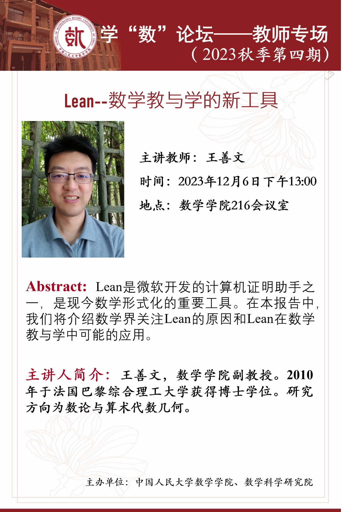 教师专场的第三期报告将于2023年12月6日下午13:00在伟德国际victor1946216会议室举行,本场报告的主讲教师为王善文,报告题目为《Lean--数学教与学的新工具》。