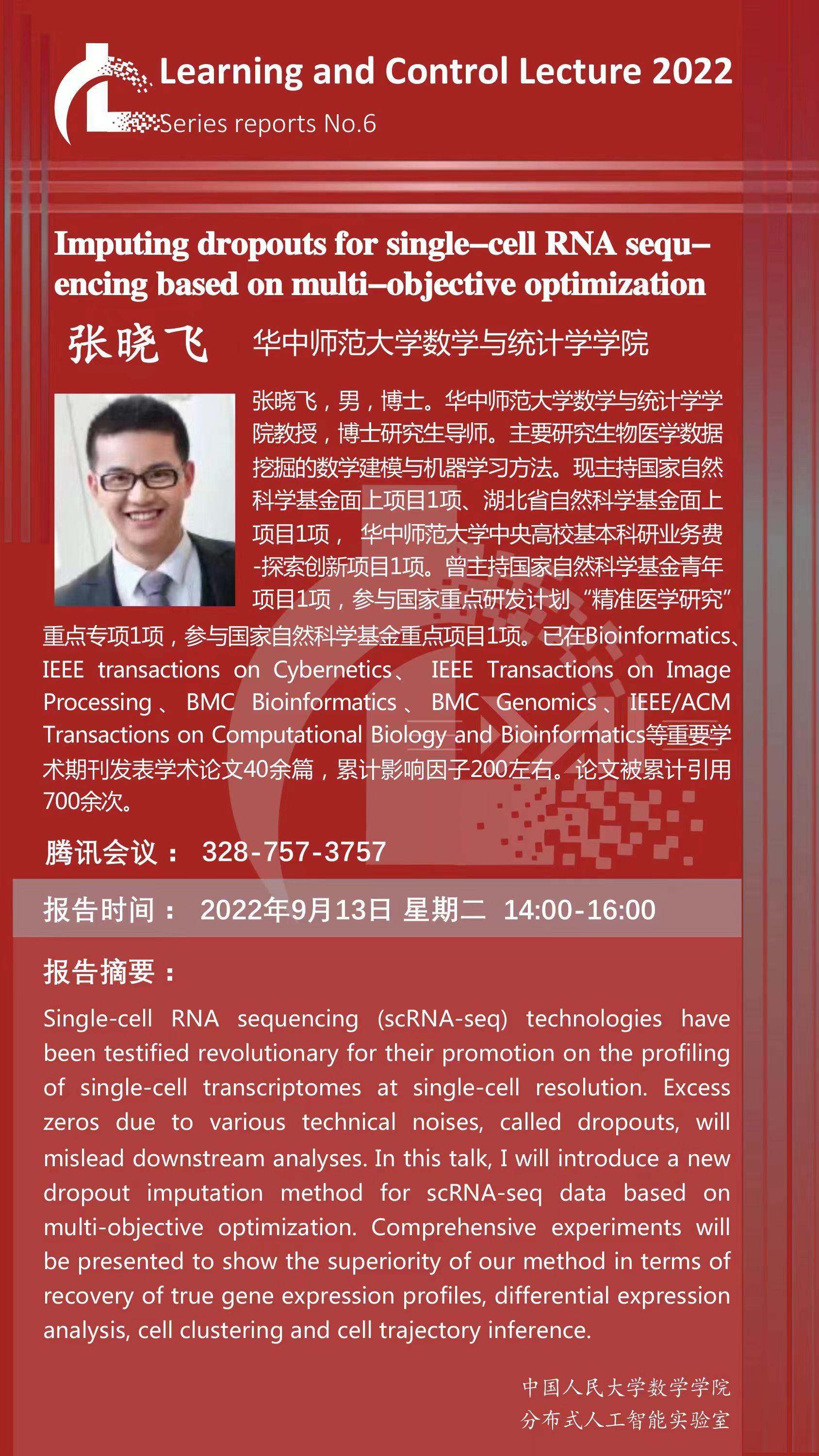 报告人简介:张晓飞,男,博士。华中师范大学数学与统计学公司教授,博士研究生导师。主要研究生物医学数据挖掘的数学建模与机器学习方法。现主持国家自然科学基金面上项目1项、湖北省自然科学基金面上项目1项, 华中师范大学中央高校基本科研业务费-探索创新项目1项。曾主持国家自然科学基金青年项目1项,参与国家重点研发计划“精准医学研究”重点专项1项,参与国家自然科学基金重点项目1项。已在Bioinformatics、 IEEE transactions on Cybernetics、 IEEE Transactions on Image Processing、BMC Bioinformatics、BMC Genomics、IEEE/ACM Transactions on Computational Biology and Bioinformatics等重要学术期刊发表学术论文40余篇,累计影响因子200左右。论文被累计引用700余次(谷歌学术)。