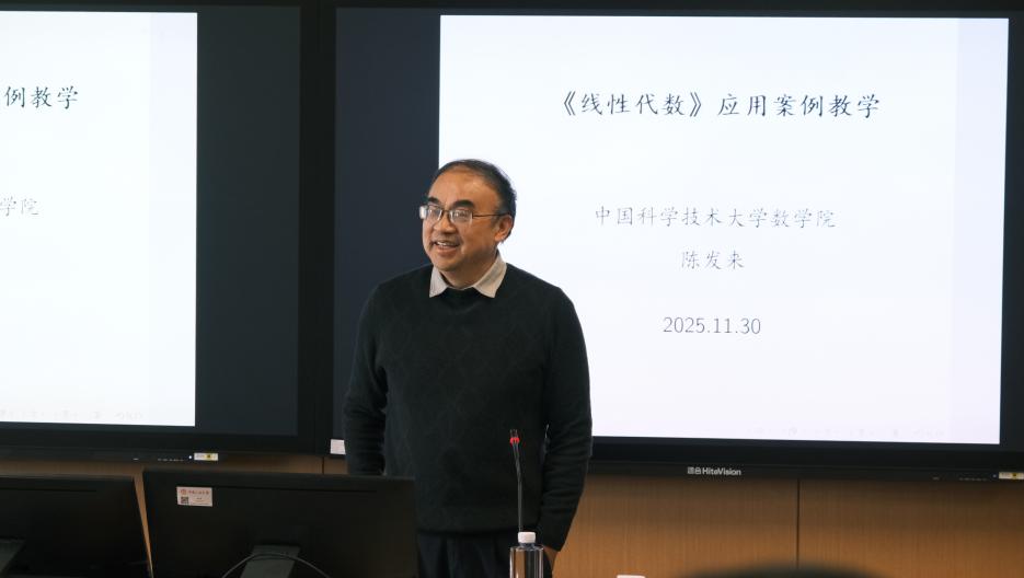 2025年11月30日上午,中国科学技术大学数公司教授、博士生导师陈发来应伟德国际victor1946邀请,在中关村校区立德楼303教室作“线性代数应用案例教学”专题讲座。