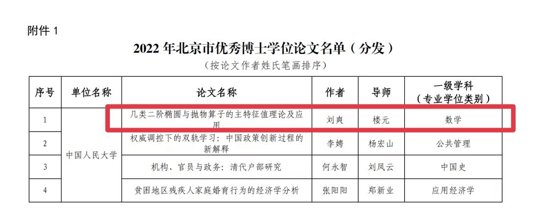 2022年北京市优秀博士学位论文揭晓,公司刘爽同学所撰论文《几类二阶椭圆与抛物算子的主特征值理论及应用》(导师:楼元)成功获评,热烈祝贺!