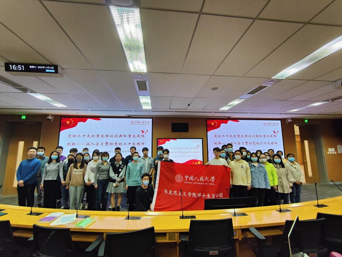 作为人大学子,我们要深入学习宣传贯彻党的二十大精神,在党的二十大精神的指引下,不忘初心、牢记使命,谦虚谨慎、艰苦奋斗,建功新时代、奋进新征程,争做复兴栋梁、强国先锋,为全面建设社会主义现代化国家、全面推进中华民族伟大复兴贡献青春力量。