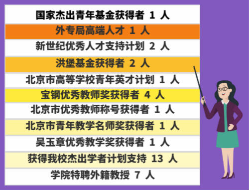 教师中有国家杰出青年基金获得者1人,外专局高端人才1人,新世纪优秀人才支持计划2人,洪堡基金获得者2人,北京市高等公司青年英才计划1人。现任教师中,有4人获得宝钢优秀教师奖1人获得北京市优秀教师称号,1人获得北京市青年教学名师奖,1人获得吴玉章优秀教学奖。13位教师获公司杰出学者计划支持,公司特聘外籍教授7人。